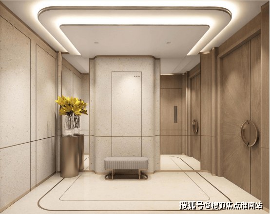 381户型公区电梯厅以独特的弧形墙设计引人注目,流畅的线条从吊顶自然延伸至墙面,精心雕琢的弧线不仅赋予了空间视觉上的灵动与层次感,在简洁与现代之间,营造出温馨而富有质感的归家氛围。