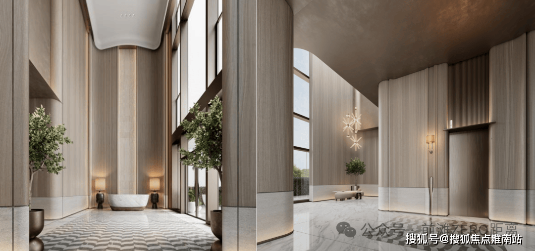 285户型公区以酒店式精奢风为灵感,重塑归家仪式感。约10米挑高入户大堂,石材拼花地面与木纹蜂窝铝板墙面交相辉映,低调中尽显奢华质感。