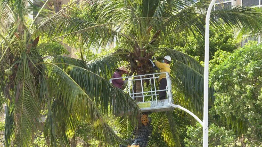 闸坡旅游大道两侧遍植椰树,是一条尽显海岛风情的市政道路。此前受台风侵袭影响,加之秋冬季节树木进入落叶期,枯枝、病枝易积累,道路两侧椰树的枯枝、病枝、垂枝数量增多,不仅阻碍椰树健康生长、影响市政道路整体景观,更存在枯枝掉落砸伤行人的安全隐患。前期,区市政建设事务中心已启动椰树专项管护工作,组织工人对各类危枝、劣枝进行集中清理。11月5日,记者在旅游大道现场看到,园林工人登上作业升降机,运用专业电锯精准切割枯萎、下垂的枝叶,预计数日内可完成全部清理工作。