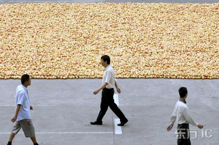 中广网兰州9月7日消息 2007年9月6日上午,首届上海艺术博览会国际当代艺术展在沪开幕。亚洲当代艺术界终于有了最高规格的国际性当代艺术品交易盛会,但是这次在展览中心门外压路机碾压上万苹果的行为艺术引起了很多市民的争议声。